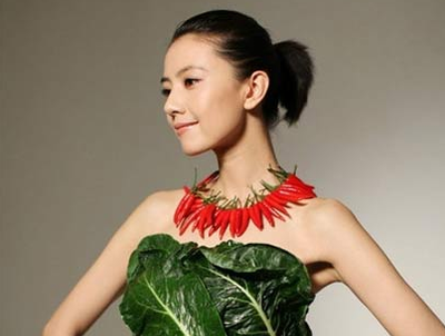 红辣椒项链、樱桃番茄手链、生菜叶和捲心菜叶拼贴而成的抹胸拖地长裙——这不是在电影片场,也不是服装秀场,而是高圆圆为亚洲善待动物组织(PETA Asia)而准备的「蔬菜晚礼服」,拍摄了一组主题为「素由心生」的公益广告,旨在呼吁公众摒弃肉食,选择关爱动物且健康的素食生活。